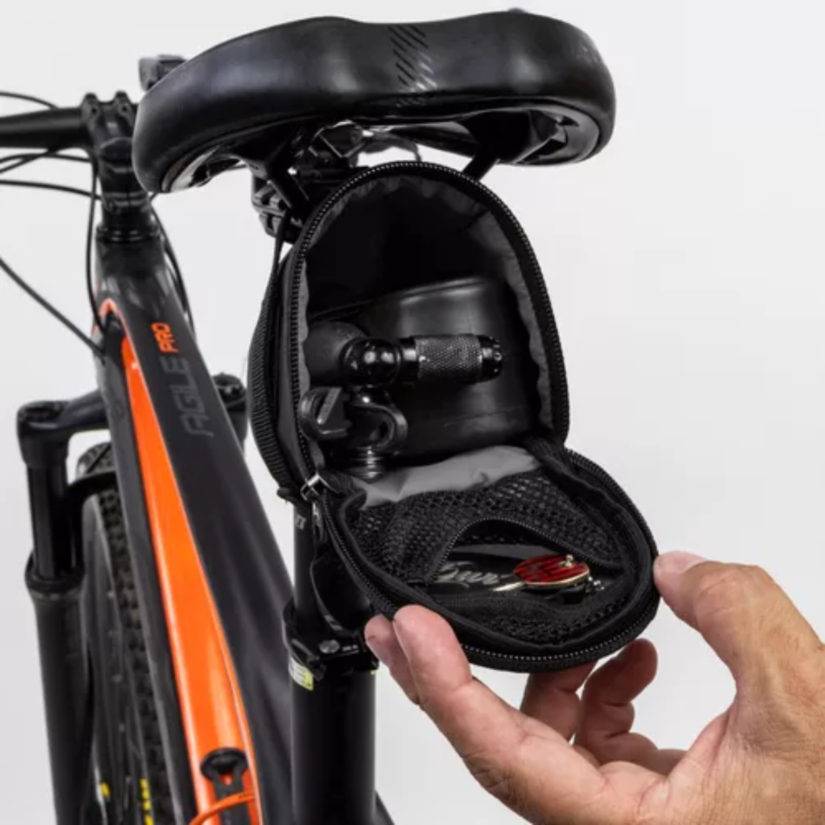 Bolsa de selim com compartimento único para transporte de pequenos objetos, como por exemplo, câmara de ar extra e ferramentas. Possui um pequeno bolso na tampa com tecido telado. É um produto leve e estável, ideal para ciclistas urbanos e trilhas. Confeccionada em tecido Velox 257 e estruturada com EVA de 2mm. O sistema de fixação é através de fechos de 20mm e fecho de contato. É um produto leve e estável, ideal para ciclistas urbanos e trilhas.